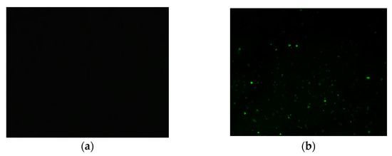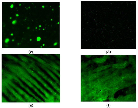 The dispersion of the polymer modifier in the asphalt was observed using an upright high-resolution fluorescence microscope (FM) (Figure 8). In particular, a Nikon two-photon laser confocal superresolution microscope was employed at a magnification of 10 × 10. The observed asphalt samples were prepared by dropping hot asphalt into glass slides and pressing them into thin layers with cover glass [31]. Under fluorescence irradiation, the polymer was generally observed as green and the base asphalt as black.