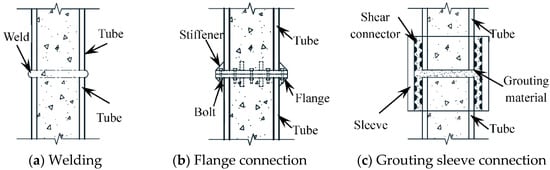 Concrete filled steel tube structure has the advantages of high bearing capacity and a good economic effect. In recent years, it has been applied more often and studied in the field of construction engineering [,,,]. Due to the limitations of raw material length, hoisting, and transportation capacity, concrete filled steel tubes often have the problem of lengthening steel tubes in the construction process. []. Welding (Figure 1a) is one of the main ways to lengthen the steel tube of concrete-filled steel tubes at present. It has the advantages of not being affected by the size of the specimen and a convenient construction process. The stress concentration is easy to occur at the weld line [], and the welding quality is easily affected by anthropic, climate, environment, and other factors, resulting in some quality problems []. In addition, there are flange connections (Figure 1b) and grouting sleeve connections (Figure 1c) for the extension of concrete-filled steel tubes.