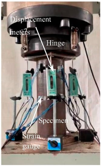 After adjusting of the specimen and equipment, the specimen is step loaded according to the estimated bearing capacity []. Within the elastic range, the loading of each stage is 1/10 of the estimated bearing capacity, the instrument data is recorded after each stage of loading, and the next stage of loading is carried out after holding the load for 2 min until it reaches 60% of the estimated bearing capacity. Then, load at the rate of 2 kN/s until the compressive displacement reaches 30 mm (about 75,000 με).