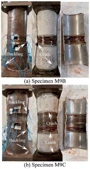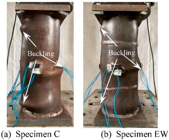 Figure 6 shows the failure modes of the ordinary specimen and the welded specimen. Both specimens show outward buckling failure bounded by the end plate/weld line (which was caused by the higher weld strength due to full penetration weld is adopted), which was consistent with the results of reference [].