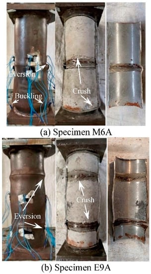 The typical failure mode of the threaded connection specimen with short thread (l = 16.5 mm) is shown in Figure 7. The eversion deformation at the butt joint of the tube (Figure 2) and the outward buckling at the end of the specimen are mainly failure characteristics. When the steel tube is cut, it can be found that the crushed part of the concrete is mainly located at the butt joint of the tube and the end of the specimen. The deformation of the concrete of all specimens corresponds to the deformation of the steel tube, indicating that the deformation of the steel tube and concrete is consistent, and the concrete has good plastic filling performance.