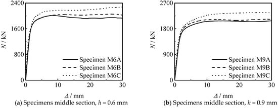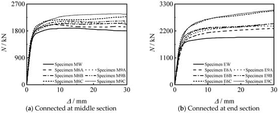 (1) The N-∆ curves of all specimens can be divided into elastic stage, elasto-plastic stage and plastic reinforcement stage. All specimens are in the linear elastic stage at the initial stage of loading, and the relationship between loading and displacement is linear. As the loading continues to increase, the specimen enters the elasto-plastic stage. Finally, the curves enter the enhanced section due to the large constraint effect coefficient of the steel tube.