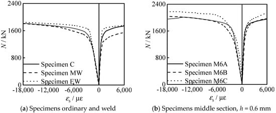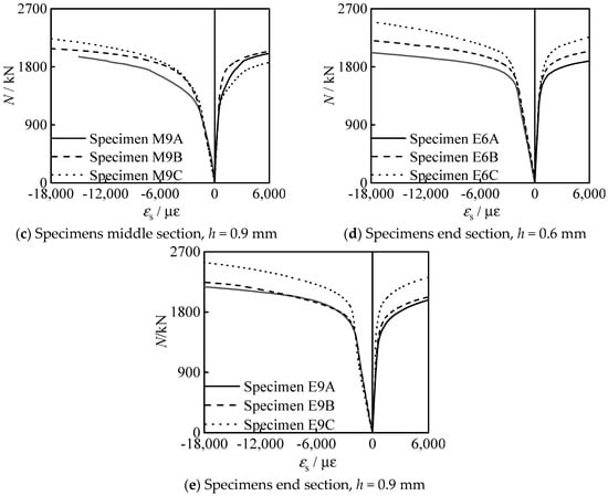 Figure 11 shows the (axial compressive loading) N-εs (steel tube strain) curve of all specimens. It can be seen that the steel tube is compressed in a longitudinal direction and tensioned in transverse direction. In the early stage of loading, the longitudinal strain is larger than the transverse strain, and in the late stage of loading, the transverse strain of steel tube increases significantly. It shows that the steel tube has significant lateral restraint on the concrete.