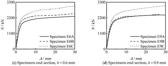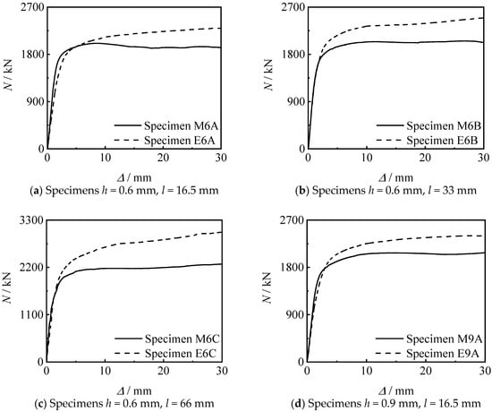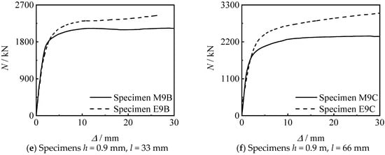 Figure 14 shows the influence of thread depth on the N-∆ curve of the specimen. It can be seen that there are few differences between the two threads depth in this test; the change of the thread depth has no significant effect on the axial compressive performance of the specimen under the same other conditions.