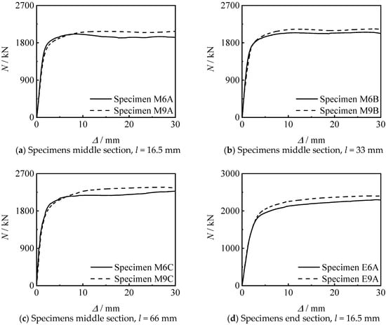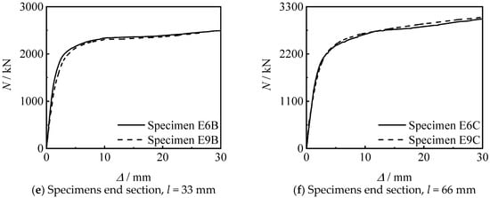 Figure 13 shows the influence of thread position on the N-∆ curve of the specimen. It can be seen that the stiffness and bearing capacity of the specimen connected at the end section are higher than those of the specimen connected at middle section, under other conditions unchanged. When the thread length increases to 33 mm and 66 mm, the bearing capacity significant increases.