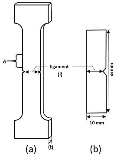 All specimens were pre-notched in the DENT geometry (V-shape), as shown in Figure 1a. The ligament lengths (l) were 2 mm, 2.5 mm, 3 mm, 3.5 mm, 4 mm, 4.5 mm, 5 mm, 5.5 mm, 6 mm, 6.5 mm, 7 mm, 7.5 mm, 8 mm, 8.5 mm, 9 mm, and 9.5 mm; each class contained 5–8 specimens. To obtain exact ligament lengths, microscope measurement was used.