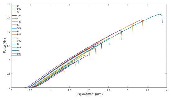 The force–displacement relationship with the ligaments from 2 mm to 9.5 mm was measured on the tension test machine. The results are shown in Figure 2. As observed, pure PLA exhibits an obviously brittle property. Toughness was calculated by the area under the force–displacement curve. Eventually, EWF toughness with various ligaments from 2 mm to 9.5 mm and the fitting curve from 2 mm to 4 mm were plotted in Figure 3. In Figure 3, toughness and ligament length demonstrate a visibly linear relationship in some ranges. It is known that measurements with the EWF method require two conditions: