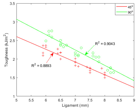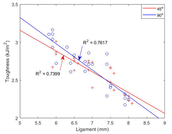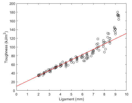 A fitting curve indicates the relationship between toughness and ligament length. After calculating, the linear relationship is as follows: