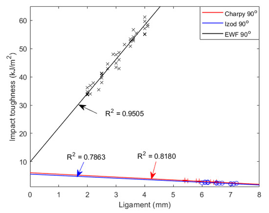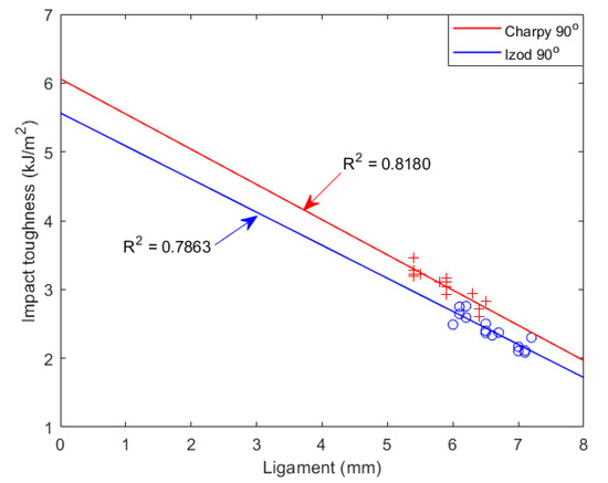 From the dynamic experimental data, the fracture energy from 5–7 mm has a visible linear relationship. The fitting curves for Izod and Charpy 90° are presented in Figure 6.