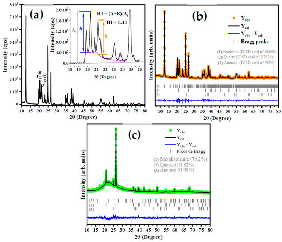 Diffractogram of kaolin with HI calculation model (a) and structural Rietveld refinement plot for kaolinite (b) and metakaolinite (c).