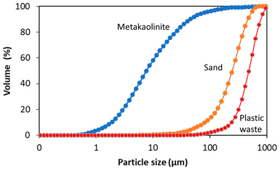 Table 3 shows the size distribution of the particles of metakaolinite, sand, and plastic waste (LDPE). The particle size of the metakaolinite in 10% (d10) is less than 2 µm, indicating that it is clay soil, according to the NBR 6502 standard [41]. The existence of larger particles in 50% (d50), 60% (d60), and 90% (d90) may be related to the lack of grinding of the kaolin in the processing, which is confirmed by the low specific surface area (1.38 m2/g).