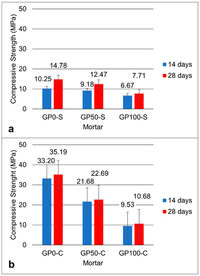 Figure 5 shows the graph of the compressive strength for the mortars of the GP-S (Figure 5a) and GP-C (Figure 5b) groups at the ages of 14 and 28 days.