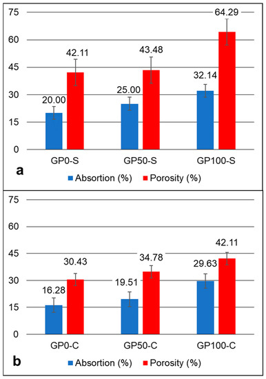 Absorption and porosity graph of the GP-S (a) and GP-C (b) mortars.