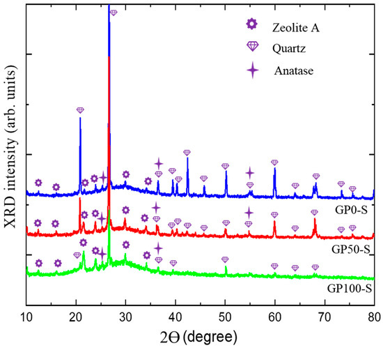 X-ray diffractometry (XRD) measurements were performed on the mortars of the group GP-S and GP-C and, thus, determined the phases found after the synthesis of the geopolymer. The test conditions were the same as those used in the characterization of the kaolin.