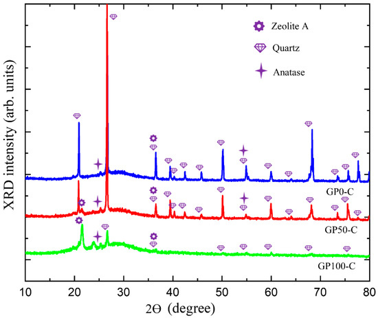 The Si–Al ratio defines the type of tridimensional structure formed in the geopolymerization and its applications in materials [45]. The Si–Al ratio in the GP-S mortar was 1.9, and for the GP-C, it was 2.4. It can be inferred that, for group C mortars, the high Si–Al ratio contributed to the higher dissolution of the aluminosilicates.