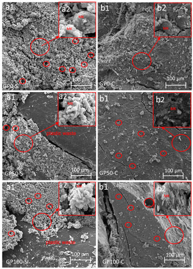 Morphology of the mortars GP0-S (a1,a2), GP50-S (a1,a2), GP100-S (a1,a2), GP0-C (b1,b2), GP50-C (b1,b2), and GP100-C (b1,b2) showing the enlarged area of unreacted material. The areas in the circles show the pores present in the sample.
