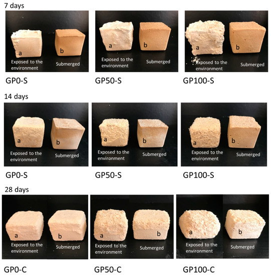 Efflorescence formation was observed in the GP-S group in samples “a” (exposed to the environment) at the ages of 7, 14, and 28 days, while in samples “b” (submerged), after 7 days, the water was migrating to the surface, gradually at 14 and 28 days, bringing with it the crystals, which crystallized and presented a similar behavior to the “a” samples. In the GP-S group, all the mortars aggressively developed efflorescence, which transported the composite material and degraded it, as observed in a more expressive form in Figure 10a,b at 28 days.