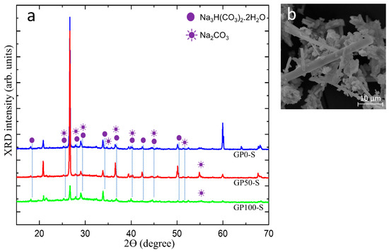 Figure 11a shows in the diffractogram of the efflorescence collected on the surface of the GP-S group mortars, the peak of the hydrated sodium bicarbonate Na3 H(CO3)2.2H2O and sodium carbonate Na2CO3 and the micrograph of the efflorescence in Figure 11b.