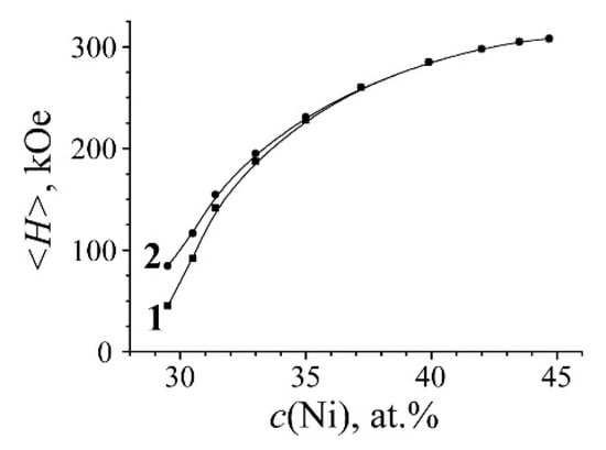 Mössbauer spectra of initial alloy and one after α→γ transformation were fitted using two-phase model for non-overlapped field regions: (i) γ-phase in the region of 0–305 kOe and (ii) α-phase in the region of 305–350 kOe. The Mössbauer spectrum of γ-phase is represented as a superposition of γ1 and γ2 phases (similarly to [26,27]) related to the austenite in different magnetic states: (i) γ1-phase is represented by the singlet and associated with austenite structural regions in paramagnetic and antiferromagnetic states with the Ni content ≤ 29 at.%; (ii) γ2-phase is related to the ferromagnetic component of austenite with acute dependence of the mean effective field value <H> from the Ni content [18,25,28,29]. Curve 1, shown in Figure 2, is calculated for binary FCC Fe–Ni alloys with 29–45 at.% of Ni within the whole field range (from 0 to 308 kOe), and curve 2 is calculated after the central component γ1 deduction. Extraction of both γ1 and γ2 phases and p(H) distribution from the spectrum permits us to perform quantitative evaluation of austenite redistribution with simultaneous development of regions depleted and enriched with Ni in the austenite structure.