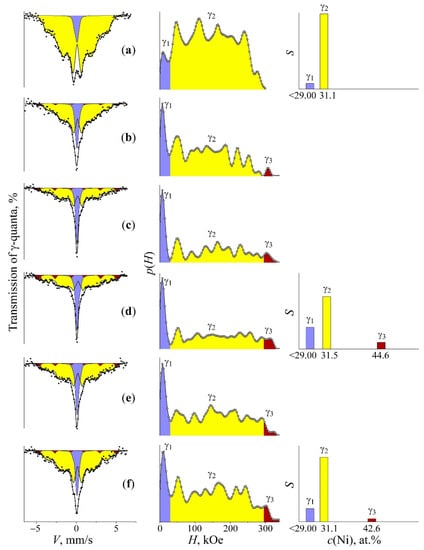 Alloy quenching in the liquid nitrogen leads to the martensitic γ→α transformation resulted in the development of ~70% martensite. Spectra of α and γ phases have significant differences and are not overlapped within the internal effective field scale (Figure 1) [22]. Sextet lines of α-phase in BCC appeared to have some small line broadening due to nickel influence on the effective magnetic field of the resonance iron [23]. The mean value of effective magnetic field of α-phase has no strong dependence from the Ni content [23,24] and shows more quantitative features. The room-temperature spectra (lower than the Curie point) of γ-phases (FCC) in alloys of the Invar range (30–36 at.% Ni) revealed a six-line shape with a wide distribution of the effective magnetic field values in the range from 0 to 305 kOe [6,25]. Spectra analysis of γ-phase was performed using a physical model of the Fe–Ni Invar with noncollinear magnetic structure [26,27]. The Mössbauer spectra appearance of the Fe–Ni Invar as well as p(H) and <H>γ distributions strongly depend on the Ni content. An atomic distribution analysis in γ-phase matrix is based on p(H) distribution and dependence between heterogeneous hyperfine magnetic field and composition fluctuations [18,25,26,27,28]. Density peaks of p(H) with larger field values are associated with austenite regions with a higher Ni content. The central part of Mössbauer spectra of γ-phase in studied FeNi31.1 alloy revealed the component with almost zero hyperfine magnetic field value which can be related to paramagnetic and antiferromagnetic regions of a metal matrix with low Ni content (less than 29 at.%) around Fe atoms. For quantitative assessment of Ni distribution in the FCC matrix, both p(H) distribution and dependence between <H>γ and Ni content are used (see Figure 2) [25,29].