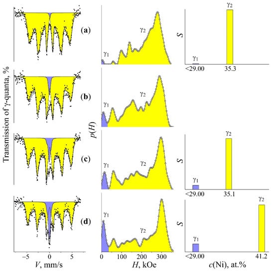 The Mössbauer spectra, the spectral components γ1 and γ2 reconstituted using p(H) and histograms of intensities S of Mössbauer spectra components and the concentration composition c(Ni) of the FeNi31.1 alloy after electron irradiation, with electron energy of 5 MeV. Treatment: (a) tempering at 1050 °C for austenite, with subsequent quenching in water; (b–d) treatment described in (a) with further electron irradiation at 120 °C, with fluence of 1018, 2 × 1018, and 5 × 1018 cm−2, respectively.