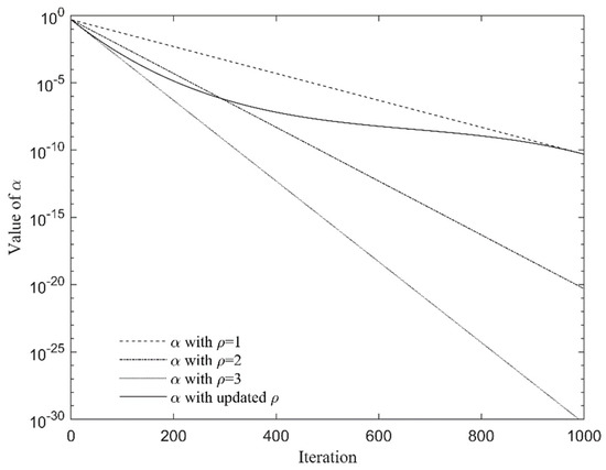 where , and ρ is defined as the reference coefficient and its value is 1. Previous tests have shown that the results drawn from an α that is of a slightly smaller value during the previous iterations (take 50 iterations for example) tend to outperform the results drawn from a greater α value in convergence speed. Previous tests have also shown that the convergence speed of the algorithm increases but the accuracy decreases gradually if is taken to be an integer constant value ranging from 1 to 3. That is to say, the decrease rate of α in a later course of iteration should be well controlled to have a good balance between exploration and exploitation to the maximum. So, let be expressed in a nonlinear form using the following equation: