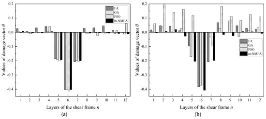 Based on the Bayesian model updating framework, model parameters are embedded in the posteriori probability function. Generally, there are two kinds of methods to solve the maximum a posteriori probability (MAP) estimate, one is the Laplace approximation and the other is random sampling of the posteriori probability distribution function. For a globally identifiable case with a large number of data, we can approximate the posterior probability distribution function as a Gaussian distribution including mean and variance, which mean is the most probable value (MPV), and the obtained MPV is the MAP estimate for the model parameters. Because MPV takes the maximum function value for the posterior probability distribution function, the solution of MPV eventually becomes an optimization problem. After completing the construction of a mathematical model for the optimization problem, the optimization algorithm can be used to find the optimal value of the mathematical model. Due to the limitations of analytical methods, numerical methods have become the most widely used methods for solving optimization problems. They can be mainly divided into two categories. The first type includes traditional optimization algorithms focusing on single-objective optimization problems, such as the Newton Iteration Method (NIM), the Conjugate Direction Method (CDM), etc. The other type includes Heuristic Algorithms (HA) for multi-objective optimization problems. Inspired by bionics, scholars have developed Metaheuristic Algorithms (MA) [13,14]. A meta-heuristic optimization algorithm allows randomness in the optimization process of the algorithm by introducing a mutation factor, thereby reducing the possibility of falling into a local optimum. At present, scholars have proposed many meta-heuristic optimization algorithms, such as the Genetic Algorithm (GA) [15], the Ant Colony Optimization (ACO) [16], the Firefly Algorithm (FA) [17], etc.