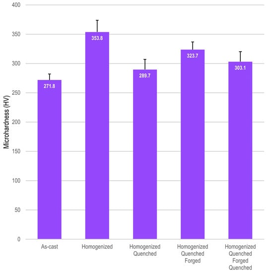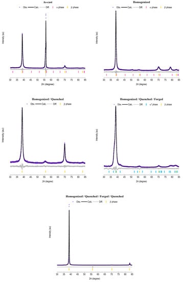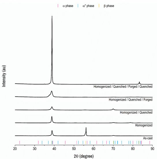XRD, optical microscopy, and microhardness measurements were performed after each step of the alloy processing route: as-cast, after homogenization heat treatment, after quenching treatment, after forging, and at the end of the processing.