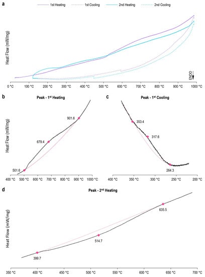 DSC of the Ti10Mo8Nb6Zr alloy. (a) Plotting the two heating-cooling cycles performed on a sample of Ti10Mo8Nb alloy in the final processing condition. The first cycle is indicated by purple. The second cycle is indicated by blue. The solid lines represent the heating. The dashed lines represent the cooling. Magnification of the area in which thermal events occur during (b) the first heating, (c) the first cooling, and (d) the second heating. The black lines represent the observed data. The pink lines represent the baseline. The initial, peak, and end temperatures of the thermal events are indicated.