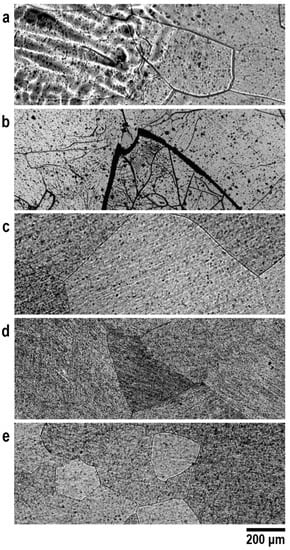 Optical microscopy was performed using an Epiphot 200 microscope (Nikon, Tokyo, Japan). The samples were polished with silicon carbide sandpaper (up to #2000) and with colloidal silica solution. Dripping of the oxalic acid solution (3% w/v) was used to assist with the polishing. The chemical etching to reveal the microstructure was carried out by immersion of the samples in a solution composed of H2O, HNO3, and HF (85:10:5). ImageJ 1.52s software was used in the analysis of the micrographs.