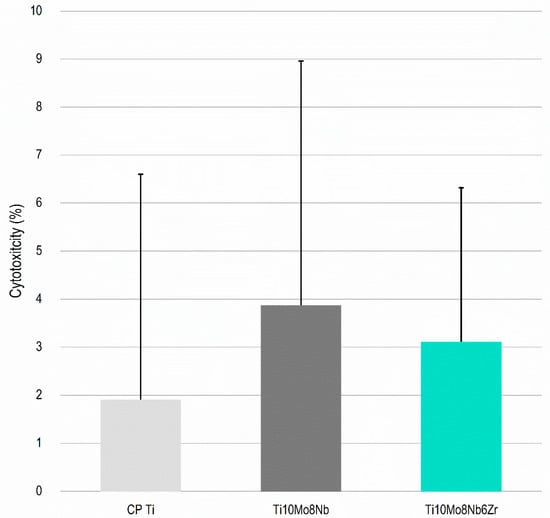 Cytotoxicity evaluation of the Ti10Mo8Nb6Zr alloy. LDH analysis on surfaces of the CP Ti, Ti10Mo8Nb, and Ti10Mo8Nb6Zr alloys after one day of cell culture. The columns indicate the average values, and the bars indicate the standard deviation.