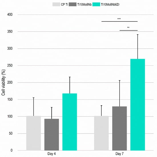 Cell growth on the surface of the Ti10Mo8Nb6Zr alloy. Cell viability after four and seven days of ADSC culture about the growth of cells on the surface of the CP TI about the cells on the surface of the Ti10Mo8Nb and Ti10Mo8Nb6Zr alloys. (**) p < 0.01, (***) p < 0.001 using the Mann–Whitney non-parametric test for independent samples, SPSS 13.0 software. The columns indicate the average values, and the bars indicate the standard deviation.