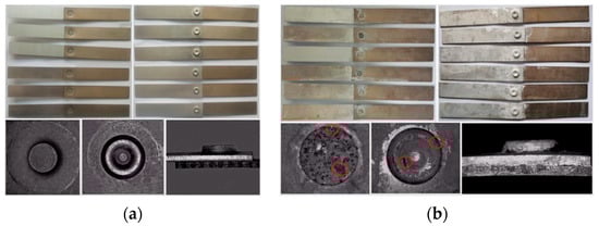 According to the research of scholars, as well as the authors’ previous works, riveting parameters, such as sheet thickness and sheet lap sequence, have great influence on the performance of self-piercing riveting joints [23,24,25]. When different metal plates are connected, the more plastic plates should be placed on the lower layer; at the same time, the rivet height should not exceed the total thickness of the plate by 3 mm. The purpose of this paper is to investigate the effect of corrosion on the performance of the joint, so the selection of parameters is not overly discussed. Subsequent work has been based on better riveting results.