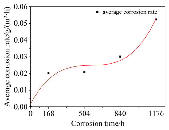 The samples with different SSC durations are weighed, five samples of the same SSC durations are weighed, and the average mass loss is calculated. Then, the average corrosion rate of the samples is obtained according to Equation (1), as shown in Figure 4. The dot and red line are the experimental and predicted average corrosion rates, respectively.