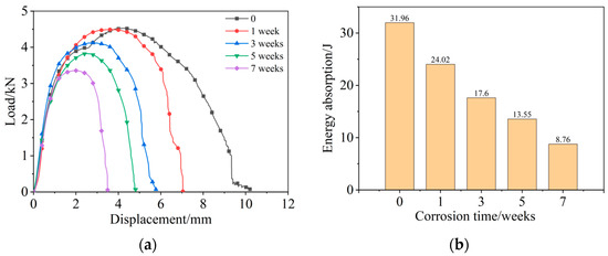 The area surrounded by the x-y axis represents the energy absorption values of the joints [40], and Figure 5b shows the corresponding values of the joints under different corrosion durations. Compared with the uncorroded joints, the energy absorption values are reduced by 24.84%, 44.93%, 57.60%, and 72.59% after 1, 3, 5, and 7 weeks of SSC tests, respectively. It can be seen that the ability of the corroded joint to withstand the action of external forces is significantly weakened.