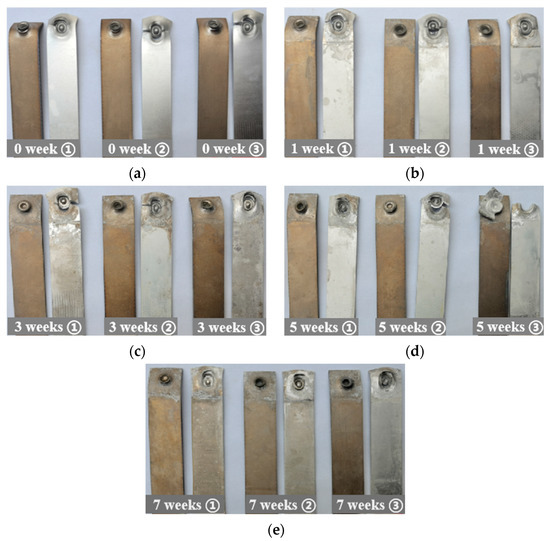 As shown in Equation (2) and Figure 4, the average corrosion rate of the samples increases with the increased corrosion time. At the beginning of the SSC durations, the average corrosion rate quickly increases; then, the steady average corrosion rate is obtained. The average corrosion rate is quickly increased at the end of the SSC durations. Due to the high chemical activity of the aluminum element, a dense Al2O3 film is formed on the surface of the aluminum sheet. The existence of the Al2O3 film on the surface of the aluminum sheet avoids the direct exposure of the aluminum sheet to the SSC environment, which reduces the erosion of the aluminum sheet by the salt spray particles [35,36,37]. At the same time, the Al2O3 film separates the aluminum sheet and the titanium sheet, which reduces the electrochemical corrosion caused by the direct contact between the two connected sheets. Therefore, the average corrosion rates of the samples corroded for 1 week and 3 weeks were smaller, as shown in Figure 4. After 5 weeks of corrosion, the Al2O3 film on the surface of the aluminum sheet is degraded and failed due to the erosion of salt spray particles. The salt spray particles are directly adhered to the surface of the aluminum sheet, which accelerates the corrosion of the aluminum sheet. Moreover, the salt spray particles that are attached to the SPR joints increase the crevice corrosion and electrochemical corrosion, resulting in the accelerated corrosion rate of the samples [38]. This phenomenon is more pronounced after 7 weeks of corrosion, as shown in Figure 4.