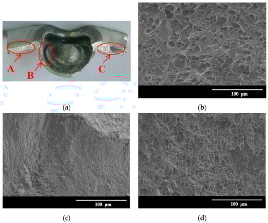 Tensile fracture morphologies of uncorroded joints: (a) macroscopic morphology of fracture; (b) enlarged view of area A; (c) enlarged view of area B; (d) enlarged view of area C.
