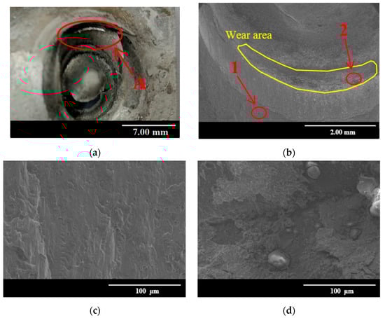 Fatigue fracture micromorphology of joints after 7 weeks of corrosion under 50% load: (a) macroscopic morphology; (b) microscopic morphology; (c) 500× magnification of area 1; (d) 500× magnification of area 2.