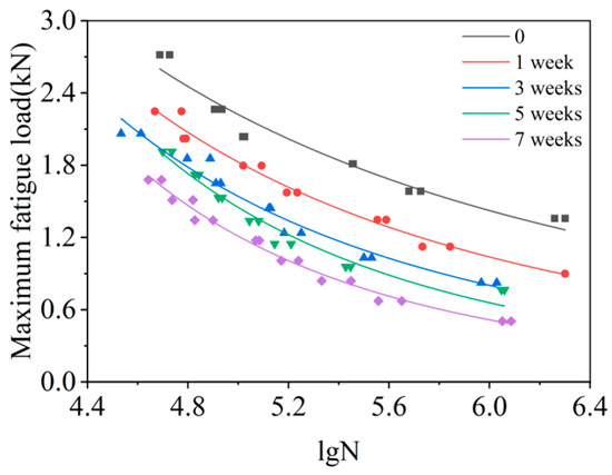 According to the F-N data, the following model can accurately describe the relationships among the maximum load, corrosion time, and cycles; Equation (3):