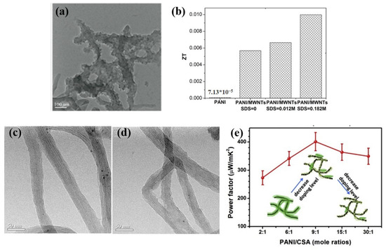 Zhang et al. [57] prepared sodium dodecyl sulfate (SDS)-wrapped porous MWNTs (core)/PANI (shell) nanostructured composites by in situ polymerization. The TEM image showed that the MWNTs were more uniformly dispersed in PANI with the addition of SDS, and the surface of PANI was porous and rough (Figure 2a). The S of the composite was improved by thermal annealing. The optimal S of the PANI-coated MWNT (ρSDS = 0.182 M) composite reached 79.8 µV K−1 and the ZT was 0.01 at room temperature (Figure 2b). Compared with PANI-coated MWNT without surfactant (ρSDS = 0), the ZT of PANI-coated MWNT (ρSDS = 0.182 M) was about twice that of PANI-coated MWNT (ρSDS = 0). Moreover, Zhang et al. [58] prepared nanotube composites with well-dispersed MWCNTs in the PANI matrix using a low-temperature grinding method. The uniform dispersion of CNT promoted the formation of a good interconnected conductive network in the composites, which contributed to enhanced carrier transport and electrical properties of composite materials.