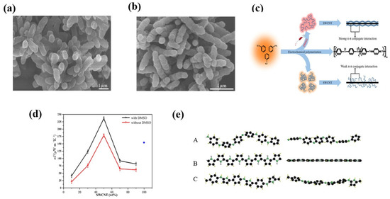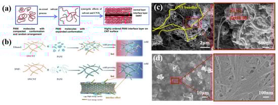 Furthermore, the three-electrode electrochemical polymerization method was also employed to synthesize high-performance PANI which was then physically mixed with CNTs [68,69]. Yin et al. [70] found that the diameter of PANI nanorods was much smaller with the addition of DMSO, as shown in Figure 4a,b. The addition of DMSO promoted PANI chains to change from coil-like to expand the structure, which improved the orderliness of PANI molecules [31,71] and enhanced the π-π interactions between PANI and SWCNTs. Therefore, a good conductive network was generated by the interfacial interactions and the ordered arrangement of PANI molecules, which facilitated carrier migration and thus improved the conductivity of the material (Figure 4c). The maximum PF of PANI-DMSO/SWCNTs reached 236.4 ± 5.9 µW m−1K−2 at room temperature when the concentration of SWCNTs was 50 wt% as shown in Figure 4d.