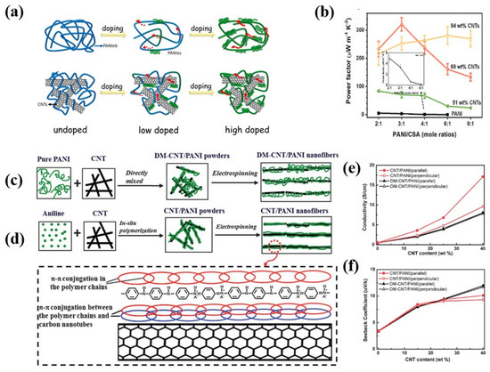 Wang et al. [92] prepared PANI/MWCNT composites by a combination of in-situ polymerization and electrostatic spinning, which successfully achieved highly oriented and ordered arranged PANI chains at the molecular level (Figure 5c,d). Due to the π-π interactions between PANI and CNTs, the orderliness of the PANI chains was initially improved during in-situ polymerization. Then it was further improved by electrostatic spinning treatment, where the electric field effect caused the PANI/CNT hybrid structure to align in parallel along fibers. The ordered molecular arrangement not only reduces the π-π conjugation defects in the polymer backbones caused by ring distortion, but also increases the effective degree of carrier delocalization, which improves the carrier mobility and enables the anisotropic TE properties. With the CNT content of 40 wt%, maximum TE performance was achieved with σ and S in the parallel direction of 17.1 S cm−1 and 10 µV K−1 at room temperature, respectively (Figure 5e,f).
