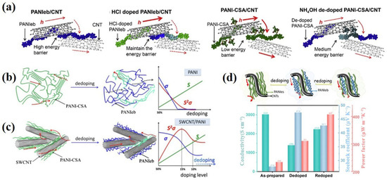 Li et al. [102,103,104] reported solvent post-treatment such as ethanol and ammonium hydroxide treatment, to adjust the doping level of PANI/SWCNTs composite films. With the partial removal of CSA content via solvent soaking treatment, the structure of PANI chains was changed from benzene to quinone, accompanied by deteriorated carrier transport along PANI chains (Figure 6b,c). However, with the addition of SWCNTs, the existence of a three-dimensional conductive CNTs network provided extra pathways to promote effective charge transport within the composite. This resulted in relatively high conductivity. In addition, the energy barrier between PANI and SWCNTs was enhanced after partial dedoping, which filtered out low-energy carriers. This induced a decreased carrier concentration, and contributed to greatly increased S. Ultimately, PF of the PANI/SWCNTs composite was significantly improved via proper modulation of the dedoping process. Overall, the final PF values of the ethanol and ammonium hydroxide-treated PANI/SWCNT composites were improved from 234 µW m−1K−2 to 362 µW m−1K−2 and 345 µW m−1K−2 at room temperature, respectively.