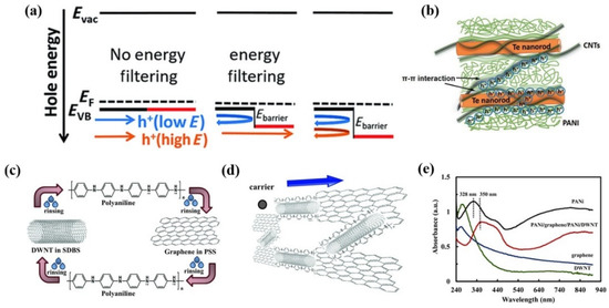 (a) Scheme of carrier energy filtering [105]; (b) Schematic illustration of interfacial interactions [23]; Schematic representation of the layer-by-layer (LbL) self-assembly procedure (c) and carrier transport in the PANI/graphene/PANI/DWNT nanocomposite (d) [109]; (e) UV–vis spectra of aqueous DWNT, graphene, PANI solutions, and PANI/graphene/PANI/DWNT film [109].