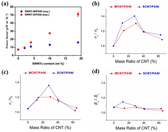 (a) Power factor of SWNT-M/PANI and SWNT-S/PANI composite films with varied SWNTs content [63]; Anisotropy properties of MCNT/PANI and SCNT/PANI composites measured perpendicular and parallel to the cold pressing pressure axis for (b) σ, (c) k, and (d) S [112].