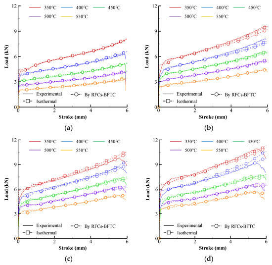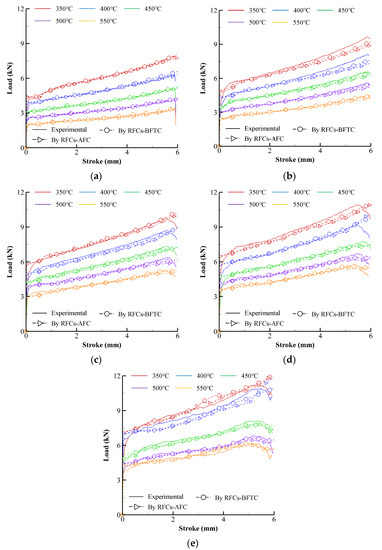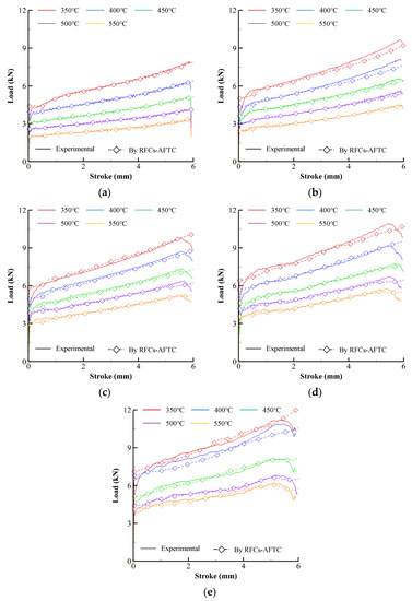 The dashed curves in Figure 2, the predicted CLSCs, were obtained using a rigid-thermoviscoplastic finite element method [33,37] with the fitted RFCs–BFTCs and the thermal material properties and process conditions found from the reference [33,38,39]. Notably, the difference between the experimental and predicted CLSCs is relatively tiny compared to the Ti-6Al-4V and AZ80A alloys [8,32], even though a distinct difference exists.