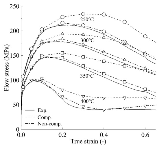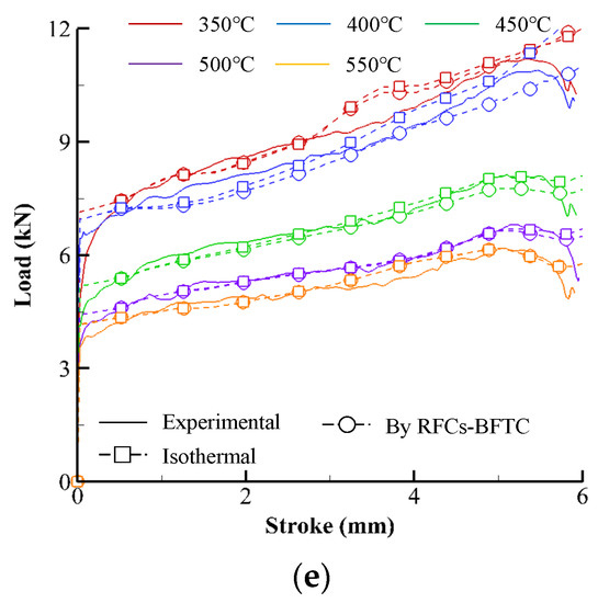 Solid lines in Figure 2 describe the experimental compression load–stroke curves (experimental CLSCs). The dashed lines with square or circle marks in Figure 2 represent the CLSCs obtained by isothermal and non-isothermal flow analyses of the cylinder compression test, respectively, using the primitive flow curves directly calculated from the experimental CLSCs (see the RFCs–BFTC in Figure 3). Note that the oscillation of the compression load of the specimen with the initial temperature (550 °C) near the melting temperature can be observed in Figure 2 as the strain rate and strain increases. The maximum measured temperature at the barreled surface reached 557 °C, implying that internal local melting might occur during the compression test at the strain rate of 20 s−1.