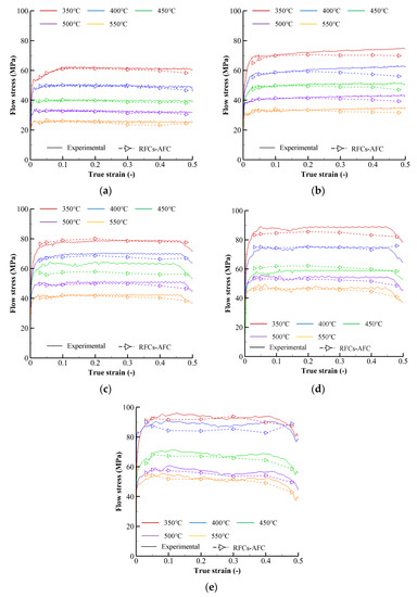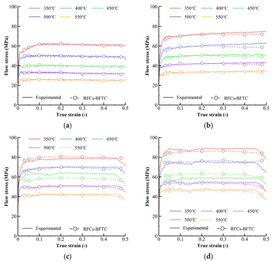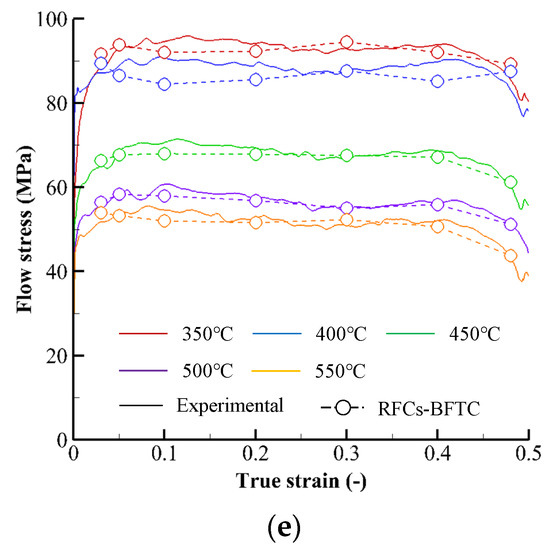 The average absolute relative error (AARE) and root mean square error (RMSE) of the fitted RFCs–BFTCs shown in Figure 3 over the strain range from 0.05 to 0.45 are 2.0% and 1.7 MPa, respectively, implying that the fitted flow curves are pretty accurate. However, it should be emphasized that the fitted flow curves in Figure 3 are primitive and need a kind of state variable compensation because they were calculated under the assumption of isothermal and homogeneous cylinder compression. The temperatures at any material points of the specimen during experiments are unknown, although those at the specific material points can be measured. As the frictional effects during the cylinder compression test cause non-uniformities of the strain, strain rate, and temperature, the plastic deformation of the materials locally heats themselves depending on their flow behavior, thermal capacity, and thermal conductivity. Notably, the temperature assigned on the flow curve in Figure 3 means the initial sample temperature of the specimen, which is fixed. Friction and temperature compensations [8,10,32] should thus be made to reveal the actual flow behavior of the material.