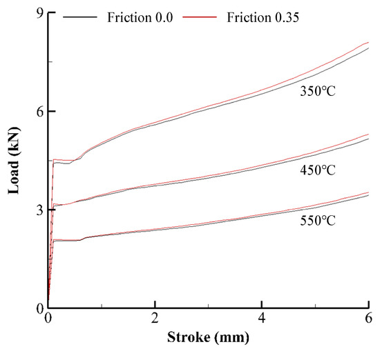 Figure 4 compares the predicted CLSCs of the two frictional coefficients of 0.0 and 0.35 at the strain rate of 0.1 s−1. The percent difference in the predicted CLSC ranges from 2.6% to 4.5% for all the test cases, revealing that the friction effect on flow behavior may be meaningful, even though it is negligible when the temperature effect is great [8,32].