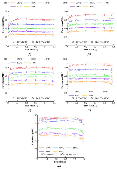 However, it is interesting to note that the improvement of the RFCs–AFTCs from RFCs–BFTCs summarized in Table 3 can be neglected, implying that the increase in flow stress by the temperature compensation (2.22% in the case of frictional coefficients of 0.35, strain of 0.46, strain rate of 1 s−1, and temperature of 350 °C) is almost the same as its decrease by the friction compensation (2.49% in the same case with above).